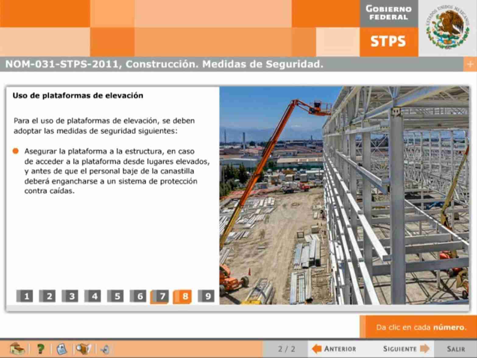 The NOM-031-STPS-2011 is divided in two multimedia courses due to the specific and comprehensive topics. The second course deals with safety measures and consists of seven thematic modules and two others corresponding to the framework and the final evaluation. The content of the thematic modules include: studies, programmes and procedures; safety measures; personal protection systems, qualification, training and information and administrative approval and records. The thematic mudules provide interactive exercises which help to understand the safety requirements that have to be observed for construction works.