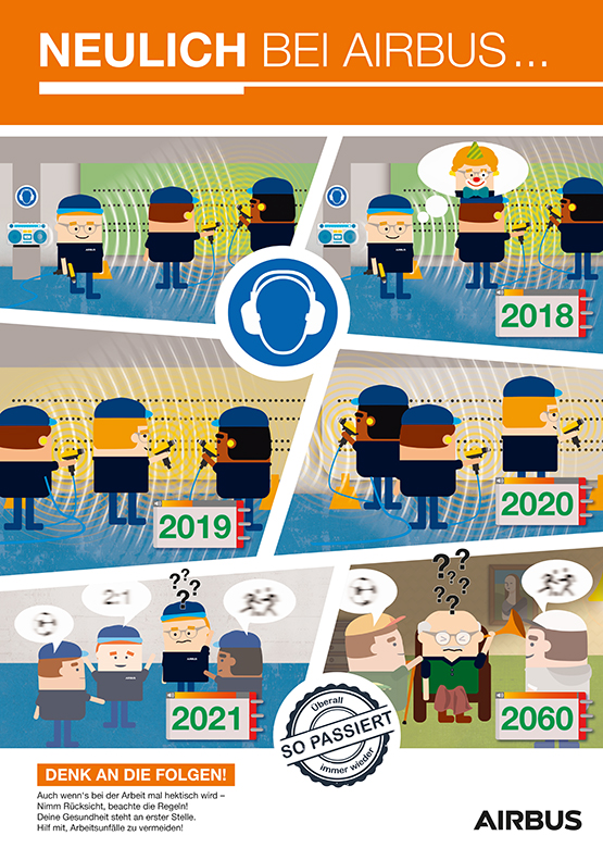 The film has been put together from nine of the 14 animated safety films produced and shown at Airbus Commercial in Germany as part of the “Recently at Airbus...” campaign. The clips are based on real accidents that actually happened in hangars, offices, and other places around the plant premises. They address the following subjects: