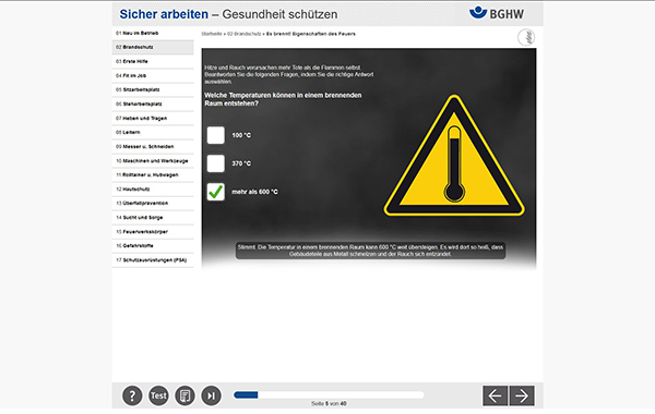 Learning modules for occupational safety issues: fire protection/alarm, first aid, hazardous substances, sitting, standing, lifting and carrying, robbery, health protection, etc. Concept: multimedia-based, interactive, didactic assessment of competences and their increase, with regard to the workplace, responsive (mobile devices)